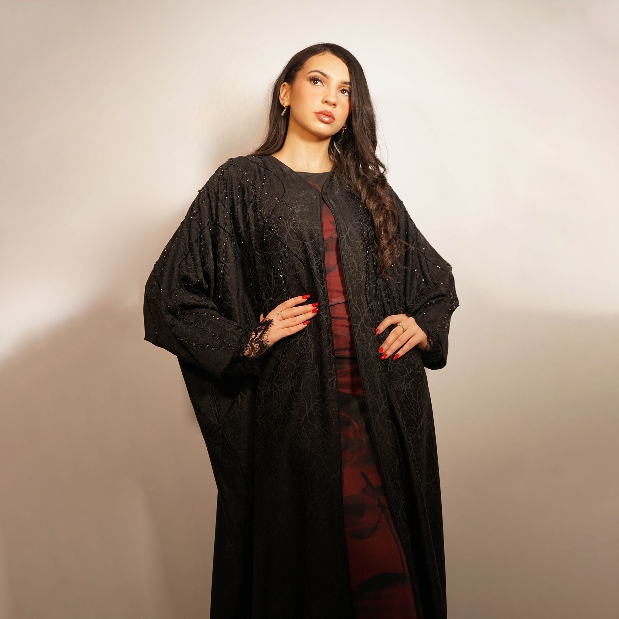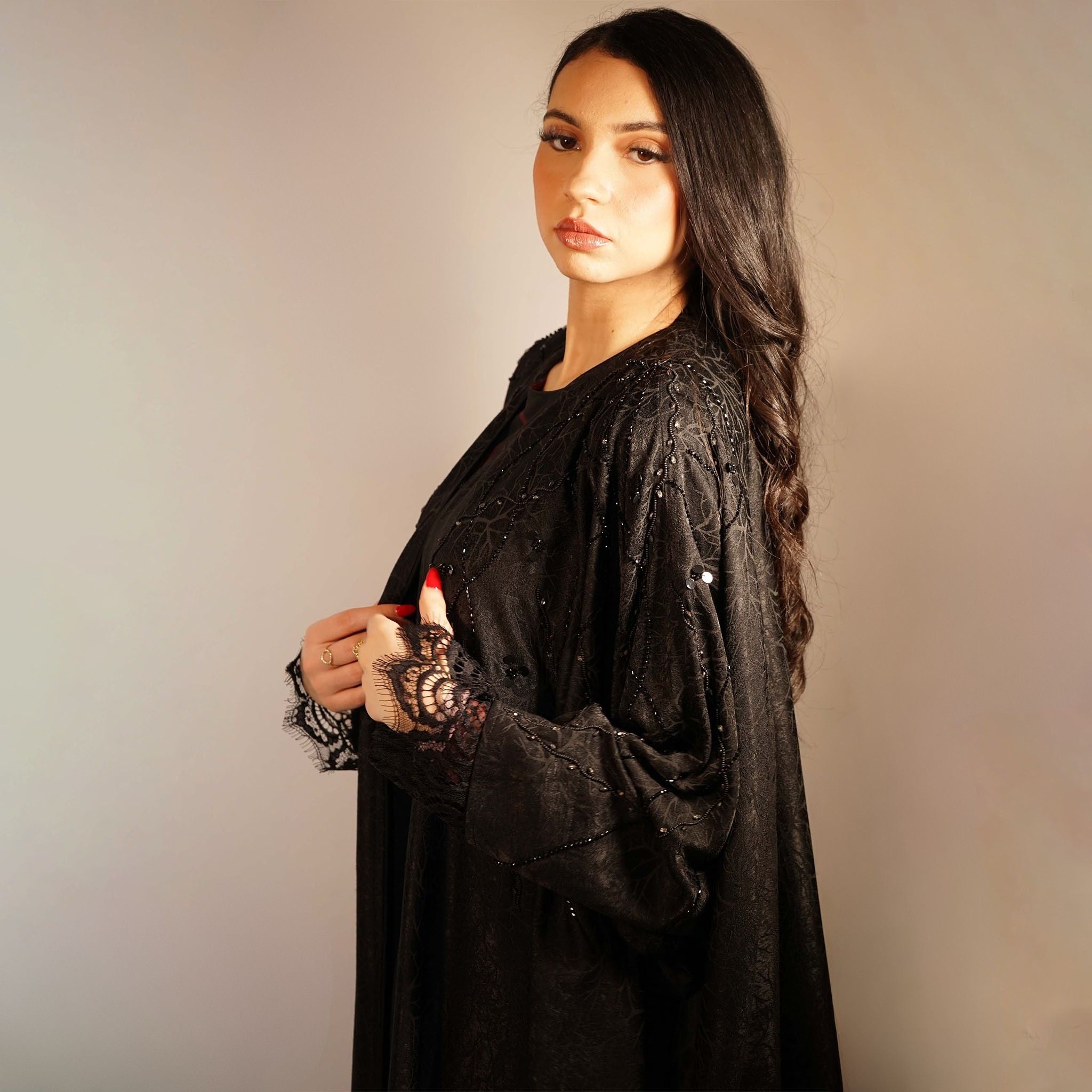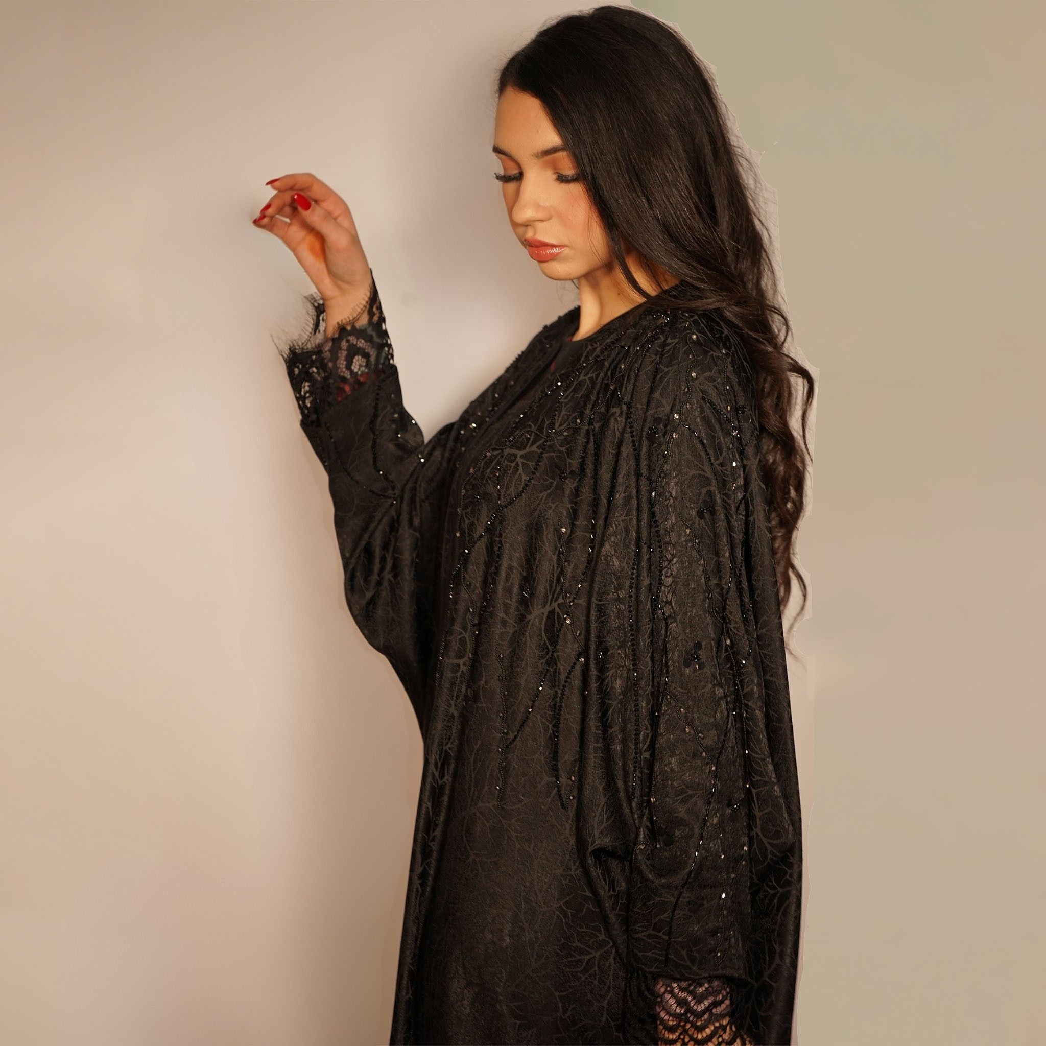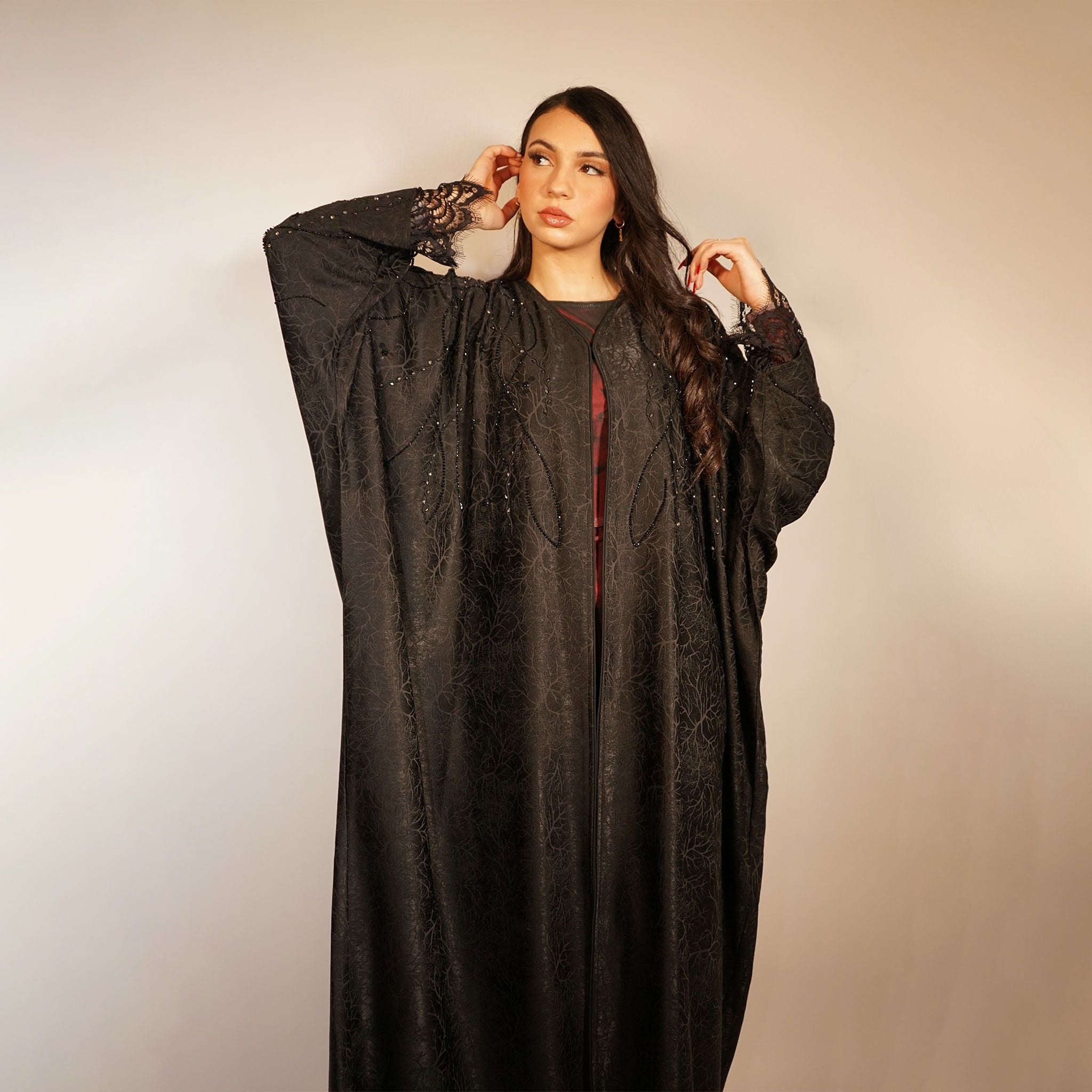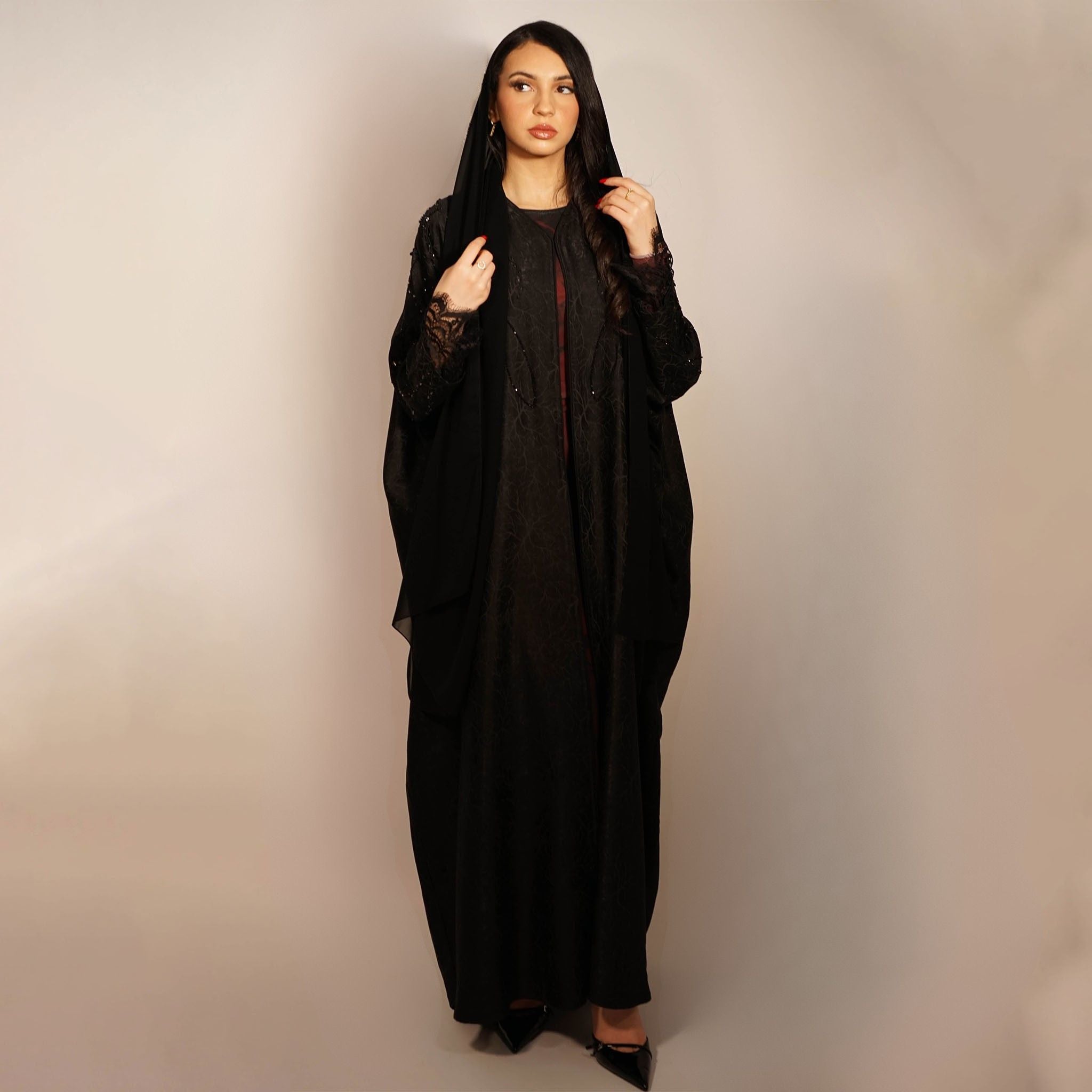 Abaya with textured fabric and hand-embroidered sleeves. Matching scarf included.
