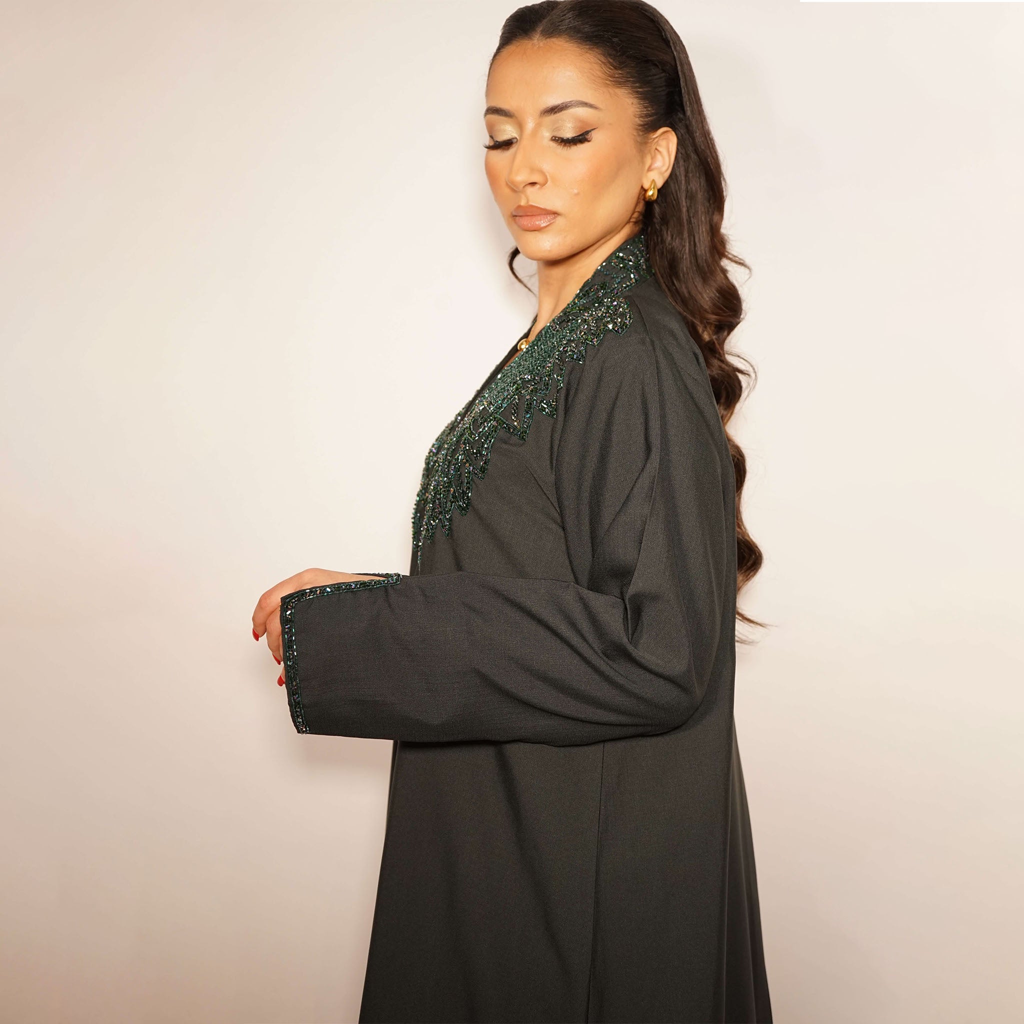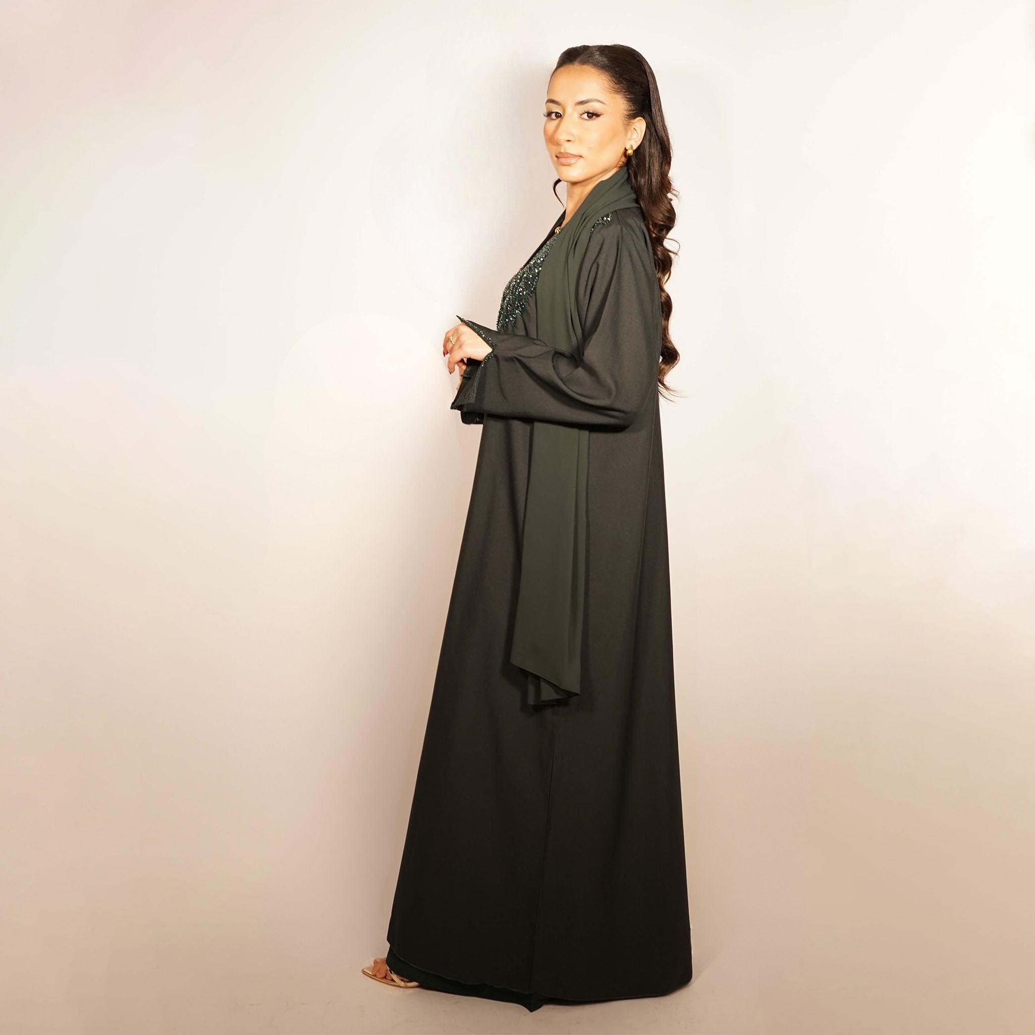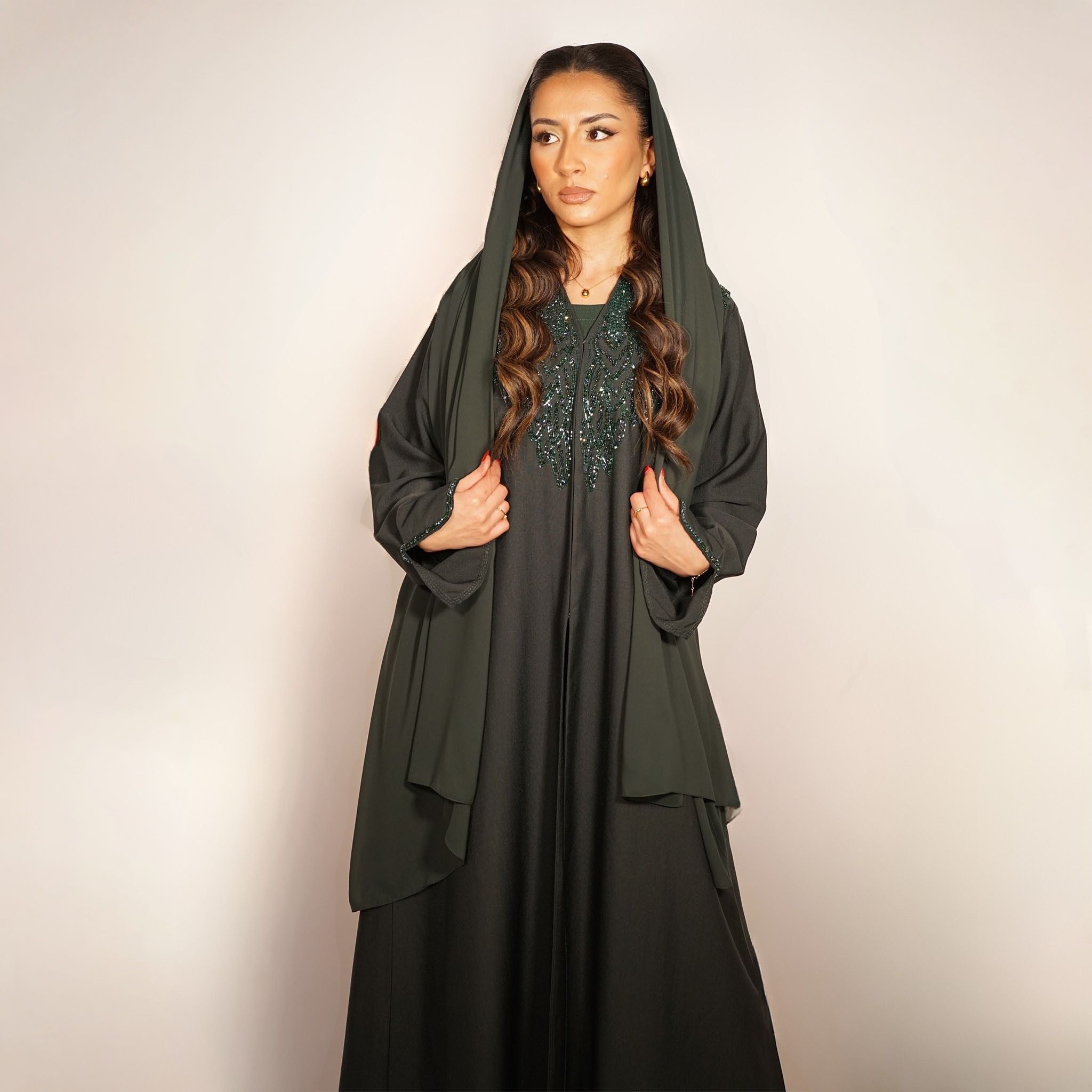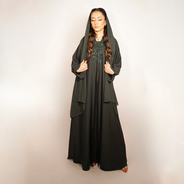 Textured pine green abaya with hand-beaded leafy embroidery. Includes matching scarf and inner dress.